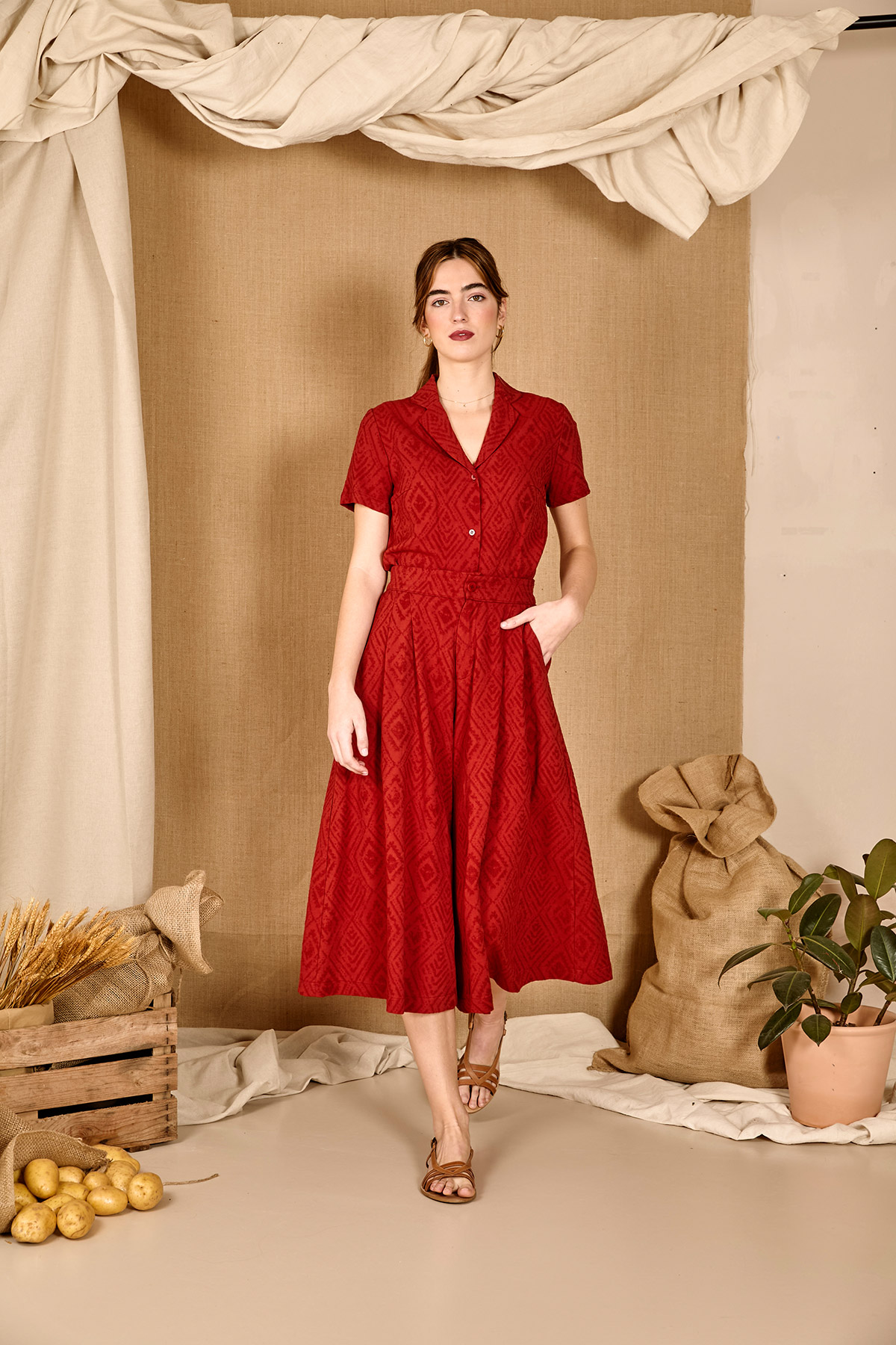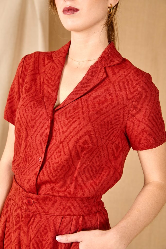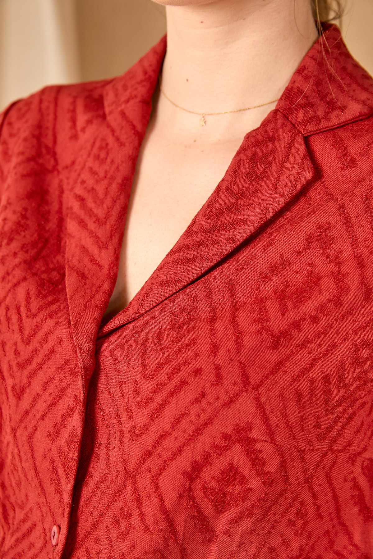 La tela preciosa, con una textura muy chula geométrica, el color un rojo oscuro precioso y sienta muy bien.